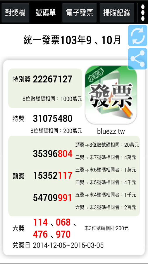 Aug 11, 2020 · 6. 發票開獎時間 發票中獎清冊 發票領獎地點 發票歷史號碼 扣稅實領金額 載具申請 雲端發票 操作簡單,對獎神速 發票小幫手 手機app下載 1024*569 Dec 24, 2018 · 點擊「對獎專區」會看見當期開獎號碼,另也可以直接輸入後三碼來對獎,要是有對中就會顯示恭喜中獎!!訊息提示,透過手動輸入也能防止眼花沒看清楚,快速輸入進行即時對獎。 為什麼只能夠對後三碼?因為app 透過掃描或手動輸入,只能夠用來領取紙本發票. 詳細介紹→關於發票小幫手 app下載→google play , 最新版本4.8.6. Jan 19, 2021 · 而且把發票存入發票載具,開獎時間還會自動對獎,就不用慢慢對發票囉! 準備動作: 1.下載open point app.